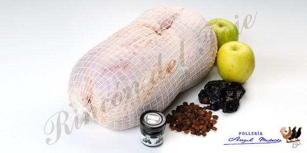 Ingredientes del relleno: carne picada de pollo y pavo, ciruelas, uvas pasas, manzana, trufa y jamón serrano, todo regado con coñac.
