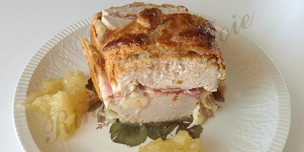 Ingredientes: 1 pechuga de pavo de 800g., 1 lámina de hojaldre (puede ser congelada), 1 bote de grasa de oca, 1 huevo, 4 lonchas finas de bacón, 4 tranchetes de queso, sal y pimienta.