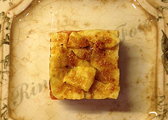 – Paso 1: Para este plato lo primero que necesitamos es un molde para emplatar. En este caso he utilizado uno cuadrado pero puede ser redondo, la medida del mío es 7,5 cm x 7,5 cm y 5cm de alto. En primer lugar colocamos una capa de salmón, a continuación una de manzana pelada y cortada como si fueran patatas para tortilla, y después una de foie. Otra vez ponemos una de salmón y terminamos con una de manzana. Cuando vayamos poniendo capas vamos presionando un poco para que al desmoldarlo no se nos derrumbe. Y otra cosa, cuando manipuléis el foie mi-cuit hacedlo rápido que se deshace enseguida. Una vez tenéis la última capa de manzana hay que espolvorearla con azúcar moreno y quemarla, bien con un soplete de cocina o con un quemador. Si no tenéis ninguna de estas dos cosas. Podéis ponerla en la sartén con un poco de mantequilla, y añadir azúcar moreno hasta que se deshaga el azúcar. Y cuando esté templada la añadís al timbal. Una vez hecho esto y después de presionar una última vez, desmoldáis. Aunque en la foto se aprecia la capa de foie bastante gruesa es el efecto al presionar un poco. Las rodajas las he cortado como de 1/2 cm para dividir entre los dos timbales.